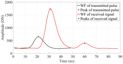 Figure 3 shows the plot of the WF data shown in Table 1, as well as the mean time of the peaks computed using the local maximum point method. The red line shows two peaks, corresponding to two objects. The time of the received signal (T1 ) is 5,295.96 ns, as displayed on Table 1. The time of each peak of the received signal (ti ) is equal to 31 ns and 60 ns, respectively, corresponding to the first (t1 ) and second (t2 ) returns. The peak position of the emitted pulse (t0 ) is 21 ns. Considering the temperature of 16.8°C and pressure of 928.2 hPa at flight high, the range of each peak can be computed and the values are 795.497 m and 799.845 m.