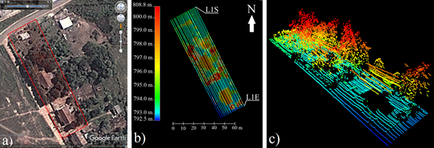 A top view of the point cloud with 22 lines is displayed on Figure 4b, the tridimensional coordinates of start (S) and end (E) points of line 1 (L1) are: L1S (587,148.169; 7,214,949.441; 793.662) and L1E (587,195.636; 7,214,852.723; 792.923). These coordinates are referenced to the World Geodetic System 1984 (WGS84) in the Universal Transverse Mercator projection system, zone 22 South. The ellipsoidal height in the study area ranges from 792.5 m to 808.8 m. Figure 4c shows the tridimensional view of the points cloud.