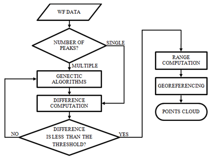 Initially the number of peaks in the WF was determined with the local maximum point, in a Simple Peak Detection (SPD) algorithm implemented in Matlab. When a single peak is detected, the standard deviation is computed from the amplitude samples and this is modeled with a Gaussian function. Then the difference between the original digitized values and the modeled curve is computed. If the difference is less than the threshold of 20 DN the process stop, otherwise the WF is decomposed with the Genetic Algorithm (GA) and, if the stop criterion is reached, the parameters of each peak are computed. After, the range is computed the georeferencing procedure is performed for the points cloud computation. Figure 5 shows the flowchart of this methodology.