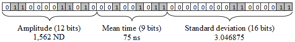For the codification of the solution as a genetic chain, the desired parameters and its format have to be specified. A single peak is described by three parameters: mean time, maximal amplitude and standard deviation. As the IWD system stores a maximum of 499 samples in order to reduce the amount of data, and in order to make digitizing technically feasible due to the high frequency operation of the ALTM Pegasus HD 500 system (Optech 2012), the binary representation of the mean time (μj ) is made with 9 bits. The amplitude (Aj ) was coded using 12 bits (4,096 DN), according to the IWD output. The standard deviation (σj ) is a real value and was represented using 16 bits and controls the width of the base of the single peak in the abscissa axis. So, a binary chain representing a single Gaussian uses 37 bits. To represent two Gaussians, 74 bits are used, and so on. Figure 6 shows the binary codification of an individual with amplitude value equal to 1,562 ND (12 bits), mean time of 75 ns (9 bits) and standard deviation of 3.046875 (16 bits).