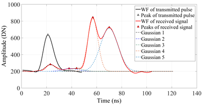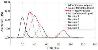 Figure 8 illustrates a complex WF example. Using the SPD method two peaks were determined and are represented as red triangles. Using the GA methodology, five peaks were detected. Again, the WF of the received signal is represented as solid line red, while each Gaussian is displayed as dotted lines. Using the DDR software, four returns were computed.