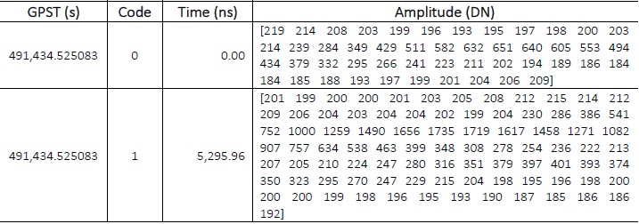 A common sampling rate for ALS FWF systems is 1 ns, applying these value in Equation 6 the range resolution is 0.15 m. However, the length measurement with the WF depends on how the target backscatters the LASER beam towards the sensor. Table 1 shows an example of the WF recorded by the IWD. The transmitted signal is represented by the code 0 and the received signal by the code 1. The GPS Time (GPST) determines the correspondence between the WF of the emitted and received signals, in addition to providing the location of the coordinates of the point of emission of the LASER beam in the trajectory of the aircraft with the ALS system.