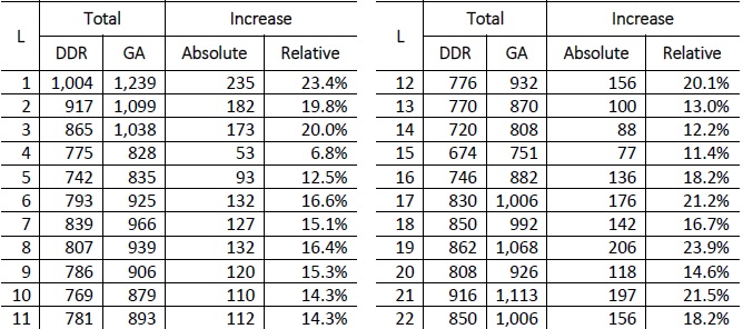 As a result of the detection of more peaks in some series, the number of points was increased in the point cloud. Table 3 illustrates the relative quantity of points computed using the DDR software and the GA methodology. For the point cloud generated with the 12 strips, there was an absolute increase of 3,021 points, which represents a relative increase by approximately 17 %. The point cloud computed by the DDR software has 17,880 points, while the GA-based method has 20,901 points.