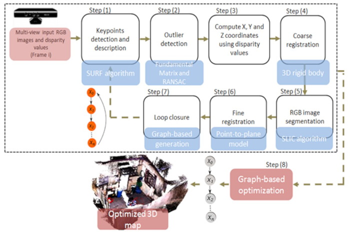 Keywords:RGB-D dataRGB-D data,SURF algorithmSURF algorithm,Disparity-to-plane modelDisparity-to-plane model,Loop closureLoop closure,Graph optimizationGraph optimization.