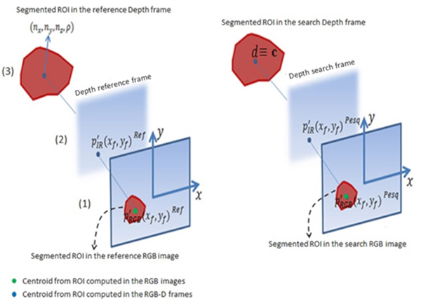 For C we determine its eigenvalues and their corresponding eigenvectors . For , the eigenvector corresponding to the eigenvalue that represents an approximation of or -n. Then, the centroid is obtained by means of the average position of all the points in each corresponding segmented ROI from search Depth frame (Pesq). Finally, c is associated to the disparity value extracted from their corresponding depth value in the Depth search image. Note that the red surfaces denote segmented ROIs in the RGB images, green points denote the computed centroid from ROI in the RGB images and blue points represent the computed centroid from ROI in the Depth frames, which 3D points are determined using Equations (1)-(3). The depth values are extracted from Depth images and there is a centroid associated to them. Finally, we refine the transformation parameters (R, t) using the disparity-to-plane model introduced by Dos Santos et al. (2016). Let cRef be the set of centroids from segmented ROI in the reference Depth frame and cPesq the set of centroids from segmented ROI in the search Depth frame, the 3D rigid transformation (T) between them consists of a 3D rotation and a 3D translation (transformation parameters). Conveniently, these transformation parameters are combined in a transformation matrix T of homogenous coordinates: