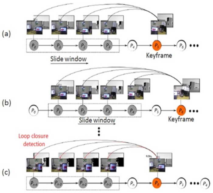 In Figure 3a, the detection of the loop closure is done by comparing the most recent frames (P5) with the previous four frames (P0,…, P3 ) belonging to the slide window, where the last frame (P4) is ignored to improve the computational cost. The slide window is defined with a fixed size of four frames in the past. In other words, for the current frame P5, the frames P0 - P3 are checked. Then, the loop closure is inserted between P5 and the old frame with greater similarity. The similarity value is determined by a probability density function, as described in Hogman (2012). In this case, an edge (U) should be added to the graph. Thus, the graph is optimized using G2O graph-based method. For the next frame P6, the window slides one step forward and the frames P1 - P4 are checked, as illustrated in Figure 3b. These tasks are successively executed until no more key frames exist, as depicted in Figure 3c. Then, whole pose graph can be optimized using a pose graph network optimizer as proposed by Grisseti et al. (2007). The graph to be optimized is written as: