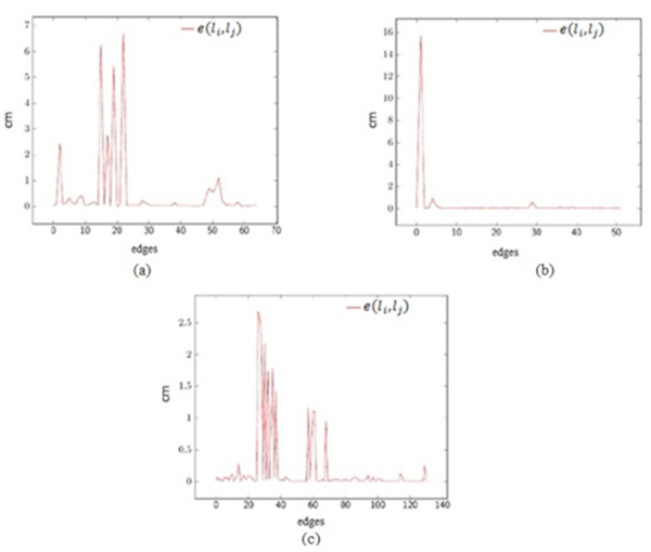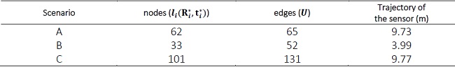 The graph optimization aims to minimize the coarse-to-fine registration errors. To verify the consistency of the optimization problem the error function e(li,lj ) is analysed. According Grisseti et al. (2007) e is a function that computes the difference between the relative position of the two nodes (liand lj ), that represents lj seen in the frame of li , and the ground observation (gi ) manually measured using a tape. In practice, e(li,lj ) is computed through the difference between the obtained trajectory of the sensor and gi . Figure 4 shows e(li,lj ) for scenarios A-C. In Figure 4, e(li,lj ) values closest to zero mean that the nodes li and lj correspond to the ground observation. Note that, the largest magnitude of e(li,lj ) was 15,9 cm found in the scenario B and the smallest magnitude of e(li,lj ) was 2,7 cm for the scenario C. Once an edge is characterized for both e(li,lj ) and the proposed matrix, when a loop closure is detected a constraint represented by between the nodes li and lj is added to weight the graph optimization task. As expected, when a joint effort of SURF algorithm and disparity-based model is executed and the loop closure is detected small e(li,lj ) values are achieved, as showed the scenario B. Usually, with textureless regions (scenarios A and C) the disparity-based model does not work appropriately and the cannot be computed. Then, the algorithm automatically attribute to the identity matrix. Consequently, are achieved high e(li,lj ) values, as show the peaks in Figure 4.