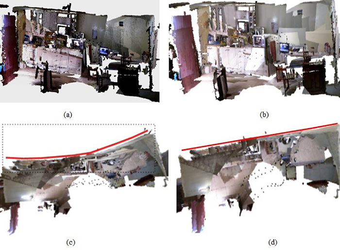 From Figure 5(c) a misalignment in the 3D indoor scenario before graph optimization can be observed (see the red curve projected in the kitchen wall). This effect is likely a result of the small local registration errors that are accumulated during the coarse-to-fine registration process. However, the misalignment and accumulated mapping errors are smoothed after the graph optimization task, as can be observed in Figure 5(d).