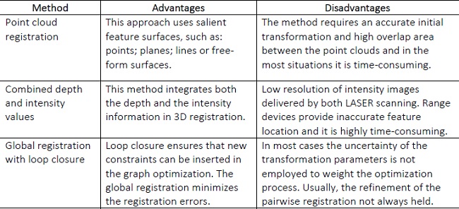 We will cover the main related work about the techniques in our study by grouping them into three main different categories: (1) point cloud registration: One of the most popular method is the ICP (iterative closest point) algorithm for registration of 3D shapes developed by Besl and McKay (1992). According Henry et al. (2012) “ICP has been shown to be effective when the two point clouds are already nearly aligned”. (2) Combined depth and intensity values: There are many combined depth and intensity extraction algorithms proposed in recent years. Al-Manasir and Fraser (2006) presented a method that uses bundle adjustment of images taken by a digital camera to register the LASER point cloud data rather than ICP algorithm. Another interesting method was given in Barnea and Filin (2008) which suggested the integration of both the depth values and the intensity information in pairwise registration process. (3) Global registration with loop closure: Loop closure is a technique used to recognize when the sensor has returned to a previously visited location. It is useful to insert constraints into graph optimization task. Henry et al. (2012) used a subset of the registered frames to keep the graph relatively sparse. The loop closure is detected based on the number of visual features stablished. In other words, a loop closure is detected if sufficient amount of correspondences is correctly determined. This is done, by means of a joint effort between RGB-D data and the ICP algorithm. Once loop closure is detected, the tree-based network optimizer is activated. In Chow et al. (2014) the ICP algorithm is carried out in a model-to-scene fashion to handle the loop closure problem. The authors used the sparse bundle adjustment to obtain a consistent 3D indoor map. A summarized description of the advantages and disadvantages of the before mentioned methods is presented in Table 1. Note that our objective is both the pairwise registration and the global registration tasks. We first propose a coarse-to-fine registration task using a joint optimization algorithm combining visual features to carry out a coarse registration and a disparity-based model to realize the fine registration step, instead of only apply a coarse registration step as done by Henry et al. (2012). Second, we use the variance-covariance matrix that describes the uncertainty of the transformation parameters to weight the graph-based optimization task. In our method, the variance-covariance matrix is obtained by minimizing disparity-to-plane distances using iterative least-squares estimator, instead of accept it as identity matrix or using the Cholesky solver such as introduced by Kümmerle et al. (2011).