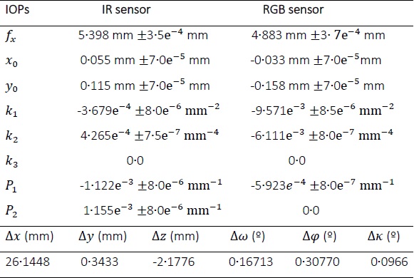 The initial estimative of 2,6 cm for the baseline distances between the IR camera and RGB camera are close to the initial approximations obtained manually with micrometer equipment. In Table 2, note that the magnitude of radial distortions is larger in the RGB images.