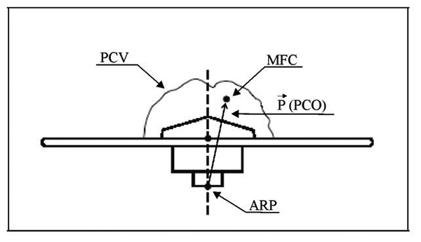 The electronic phase center of an antenna is a virtual point, where all the measurements derived from GNSS signals are referenced. The phase center can be divided into two components, the displacement of the phase center (PCO), which consists of a vector originating on the ARP and mean phase center extremity (MPC), along with the Phase Center Variation (PCV), which is dependent upon the signal incidence angle (Seeber, 2003; Freiberger Junior, 2007). Figure 1 illustrates the position of the vector (PCO), MPC, as well as the PCV.