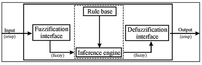 According to Jang (1993) the four functional blocks are: fuzzification - interface which transforms the crisp inputs into degrees of match with linguistic values; a rule base - containing a number of fuzzy if-then rules; inference engine - unit which performs the inference operations on the rules; and defuzzification interface - interface which transforms the fuzzy results of the inference into a crisp output.