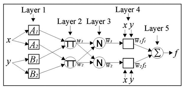 The neuro-fuzzy system ANFIS is a training routine for fuzzy inference systems of the Takagi-Sugeno type (Takagi and Sugeno, 1985). From a dataset, the ANFIS system uses a learning algorithm for identifying the system parameters based on fuzzy rules (Bystrov and Westin, 2015). Figure 3 illustrates the ANFIS architecture that considers two inputs x and y and one output z. One then supposes that the rule base contains two fuzzy if-then rules of Takagi-Sugeno's type: Rule 1: If x is A1 and y is B1 , then f1 = p1x + q1y + r1 , Rule 2: If x is A2 and y is B2 , then f2 = p2x + q2y + r2 .