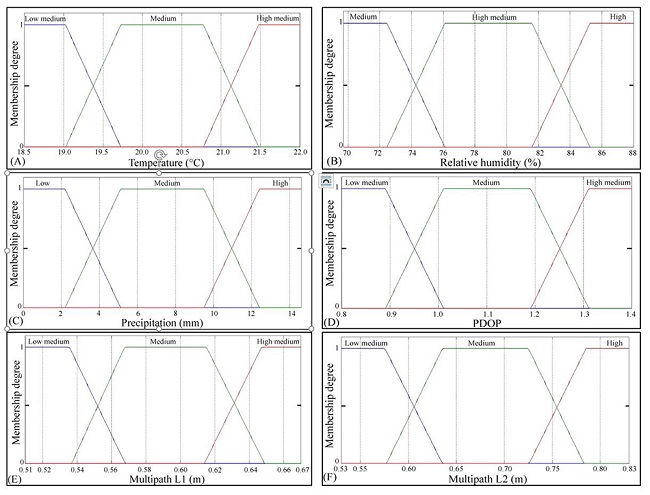 1) The domain intervals for each of the input variables temperature, relative humidity, precipitation, PDOP and the multipath effect were established. The values were taken from the whole data set obtained, and then the maximum and minimum values of each variable were inserted, defining, respectively, the maximum and minimum values of the domains (universes) of each variable.