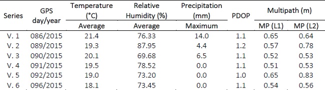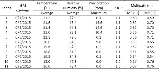 The Table 2 presents the values of meteorological variables obtained from the National Institute of Meteorology reports, the PDOP extracted from the relative calibration reports and multipath values calculated by the TEQC software.