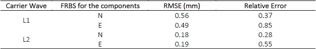 Note that the highest values for RMSE were 0.56 mm and 0.49 mm; these values correspond respectively to the FRBS for the components N and E of the L1 carrier wave. The RMSE value for the FRBS of the remaining components was equal to or less than 0.19 mm. In terms of relative error, the highest value was 0.85 for the FRBS of the carrier wave L1, and for the carrier wave L2, the highest value was 0.55 for the FRBS of components E.