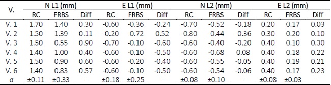 Table 6 presents the values of PCO components after the relative calibration and the FRBS for the carrier waves L1 and L2, along with the difference between the values of the components obtained by each of the methods and the standard deviation of the components for the sets of results obtained using relative calibration (Table 4) and FRBS. Noteworthy is that on the component N, the smallest difference was for the datum V. 2 with 0.11 mm, for the component E, the smallest difference was on the datum V. 2 and V. 6 with -0.29 and 1.61 mm, respectively.