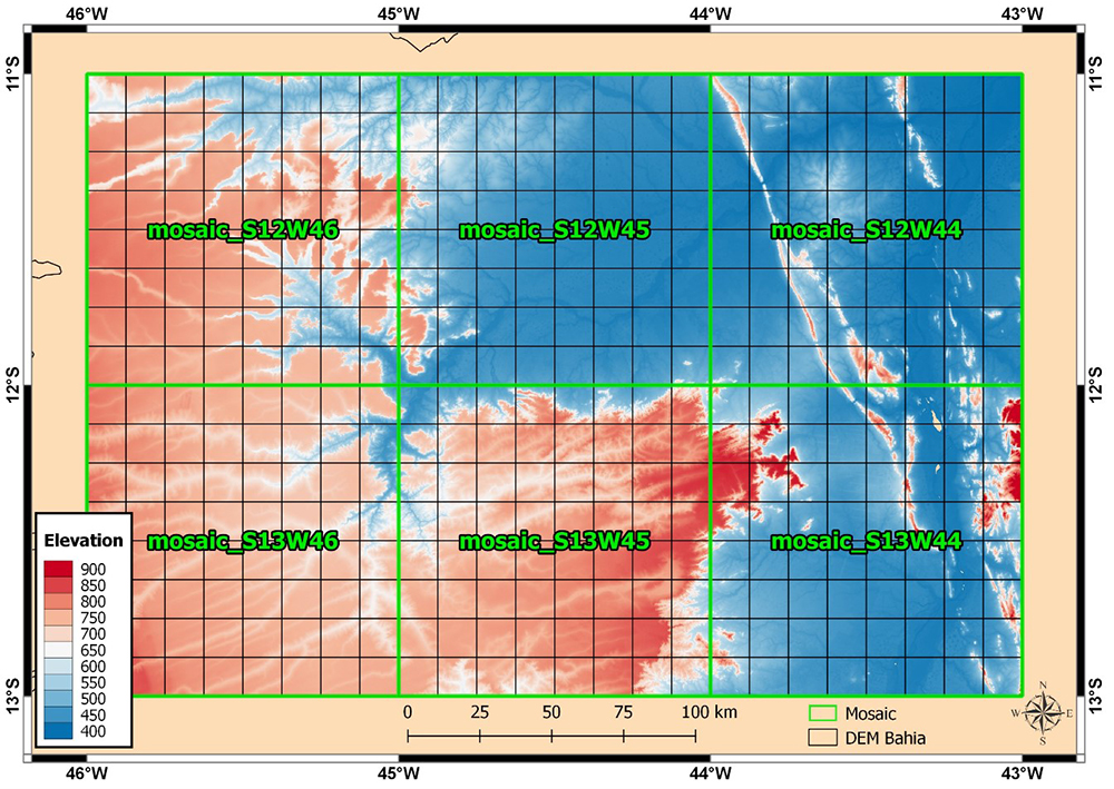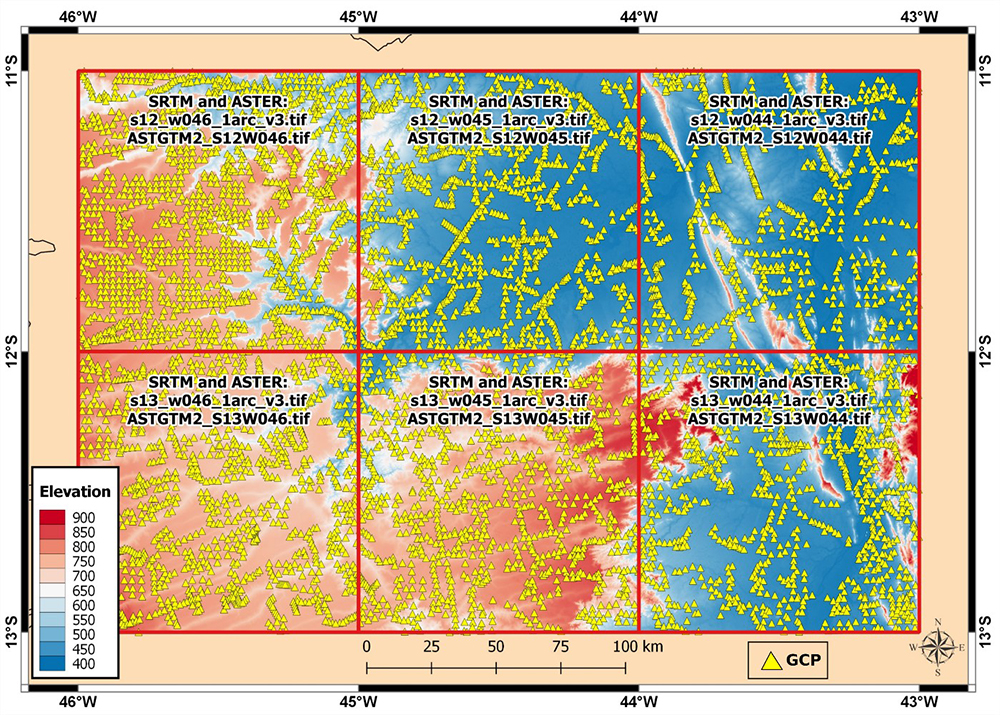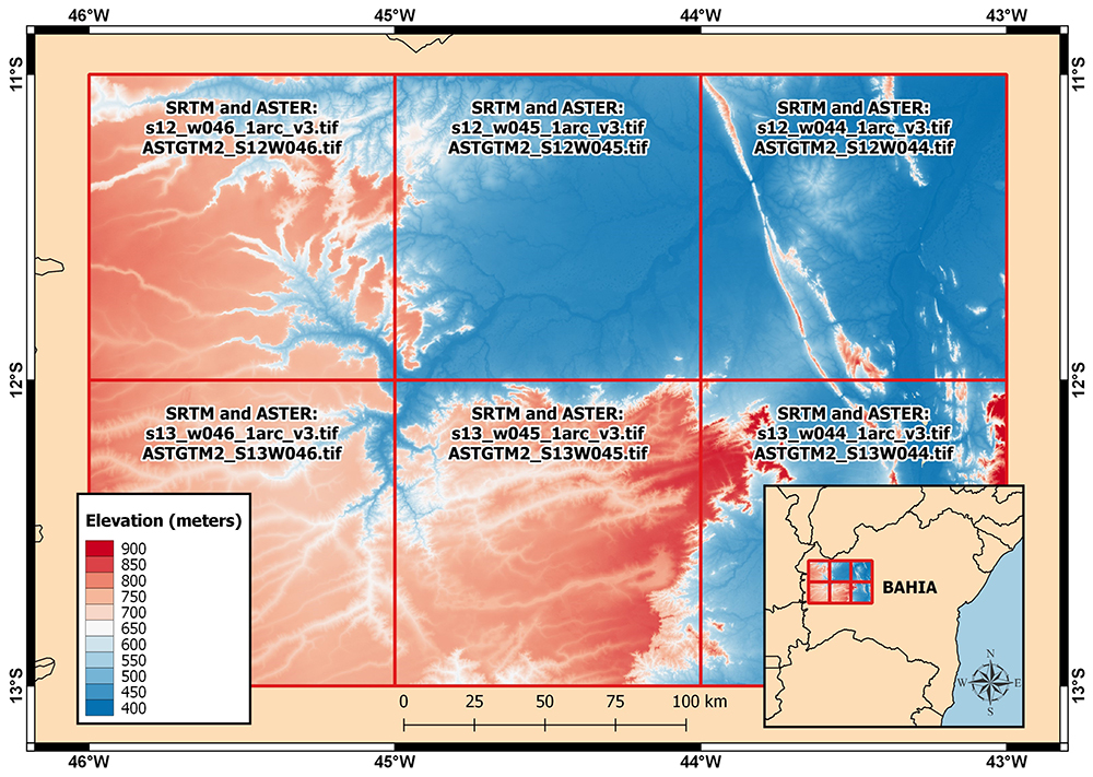 The study region covers a part of the west of the Brazilian State of Bahia, corresponding to an extension of 3º of longitude by 2º of latitude. The analyzed models correspond to the DEM ASTER v.2 and SRTM v.3, both with resolution of 1 arc-second, distributed in the 1° x 1° joint by the United States Geological Survey (USGS, 2014; USGS, 2015), according to the frame shown in Figure 1.