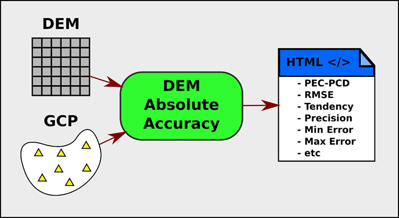 Figure 3 illustrates, through a flowchart, the evaluation process of each DEM, being this process executed by the Python script "DEM Absolute Accuracy", where the output corresponds to an HTML file containing the PEC-PCD classification result and related statistics.