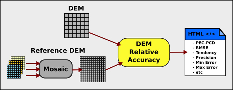 Figure 5 shows the flowchart of the evaluation process of the ASTER and SRTM DEM, executed by the Python script "DEM Relative Accuracy", which generates, in a similar way to the evaluation of absolute accuracy, an HTML file with the results.