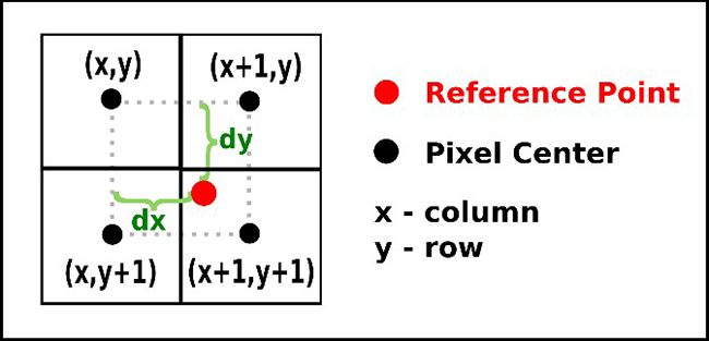 For the determination of the altitude zo , the bilinear interpolation was adopted, similar to Reuter et. al. (2009), aiming to calculate the linear influence of the altitude values f (x,y) of the 4 pixels closest to the evaluated DEM in relation to the reference point, as shown in Figure 6 and Equation (6).