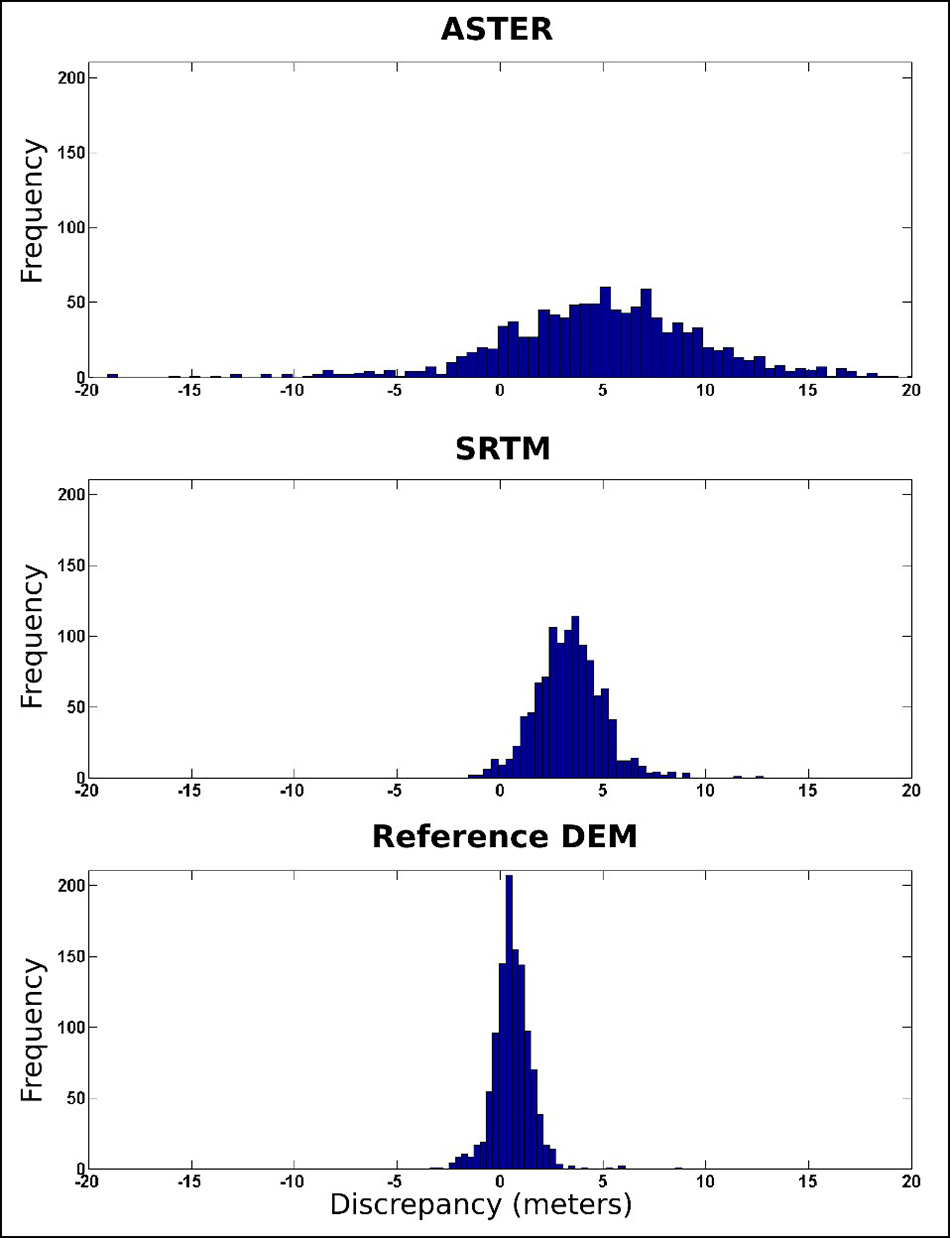 Figure 7 presents the histograms of the altimetric discrepancies of the absolute accuracy assessment for the ASTER and SRTM DEM, as well as for the Reference DEM.