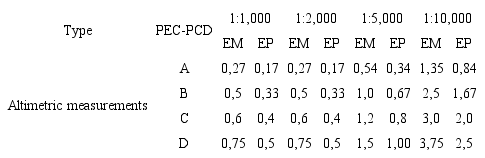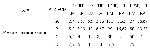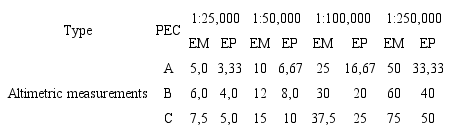 The Standard of Cartographic Exactness (Padrão de Exatidão Cartográfica - PEC) for Digital Cartographic Products (Produtos Cartográficos Digitais - PCD) in the ET-CQDG (DSG, 2016), classifies geospatial data according to its accuracy in classes "A", "B", "C" or "D", based on the maximum permissible error (EM) and the standard error (EP ) to the altimetry.