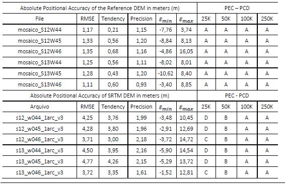 The component that interferes most in the RMSE of the SRTM is the tendency (approximately 3.7 meters). If this systematic error is eliminated, the RMSE of the SRTM will be approximately equal to the accuracy (Monico et al., 2009), that is, 2.0 meters, which would imply PEC-PCD "A" and "B" in scales 1:50,000 and 1:25,000, respectively.