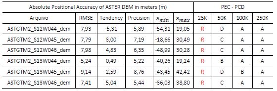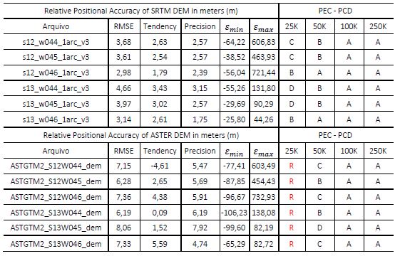 The following tables 5 and 6 present the results of the altimetric positional accuracy assessment for absolute and relative methods, respectively. It is shown statistical results of the calculated errors in meters (m) and the PEC-PCD category in which each ASTER and SRTM DEM have been classified for the following scales: 1:25,000 (25K), 1:50,000 (50k), 1:100,000 (100k) and 1:250,000 (250K). When the tables present the "R" for the PEC-PCD classification, it means that the data does not fit even the minimum standard (class "D") of the scale evaluated and therefore must be rejected.
