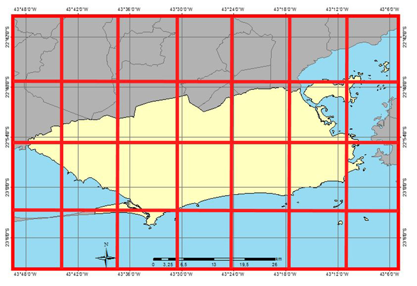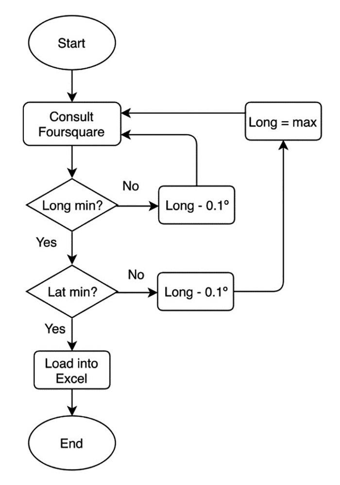 Initially, a code was implemented based on the grid search structure, in an attempt to obtain all the venues of Rio de Janeiro in the categories of interest for tourism management in Rio de Janeiro city: Museums, Historic Sites, Monuments and Landmarks, Trails, and Scenic Lookouts. This code is in accordance with the principle of spatial division into squares of dimensions of 0.1° of the total area delimited, in order to extract the information from the 4 x 7 subareas, as shown in Figure 1. The algorithm follows the programming logic presented by the pseudo code located in Figure 2.