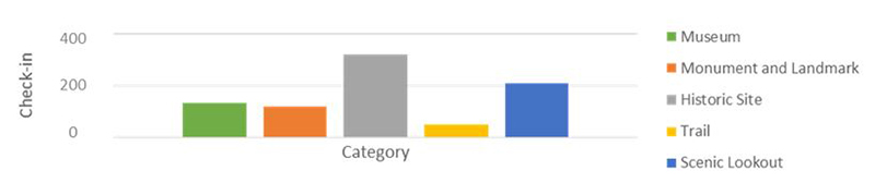 In general, it can be concluded that for the Museums, Historic Sites, and Monuments and Landmarks categories, the high density is concentrated in the Centro area of Rio de Janeiro; however, there are places outside this high-density zone with great touristic value and a high number of visits. For example, the “Trails” and “Scenic Lookouts” categories are located and most visited predominantly in the south zone of the city, with some isolated parts in the west zone in the neighborhoods of Recreio dos Bandeirantes and Grumari. It is also worth mentioning - as shown in the graph of Figure 10 - that the places most sought for visitation are the historic sites of Rio de Janeiro, followed by the scenic lookouts. In the latter, it is worth emphasizing the benefit of the geographic locus of the city of Rio de Janeiro for tourism.
