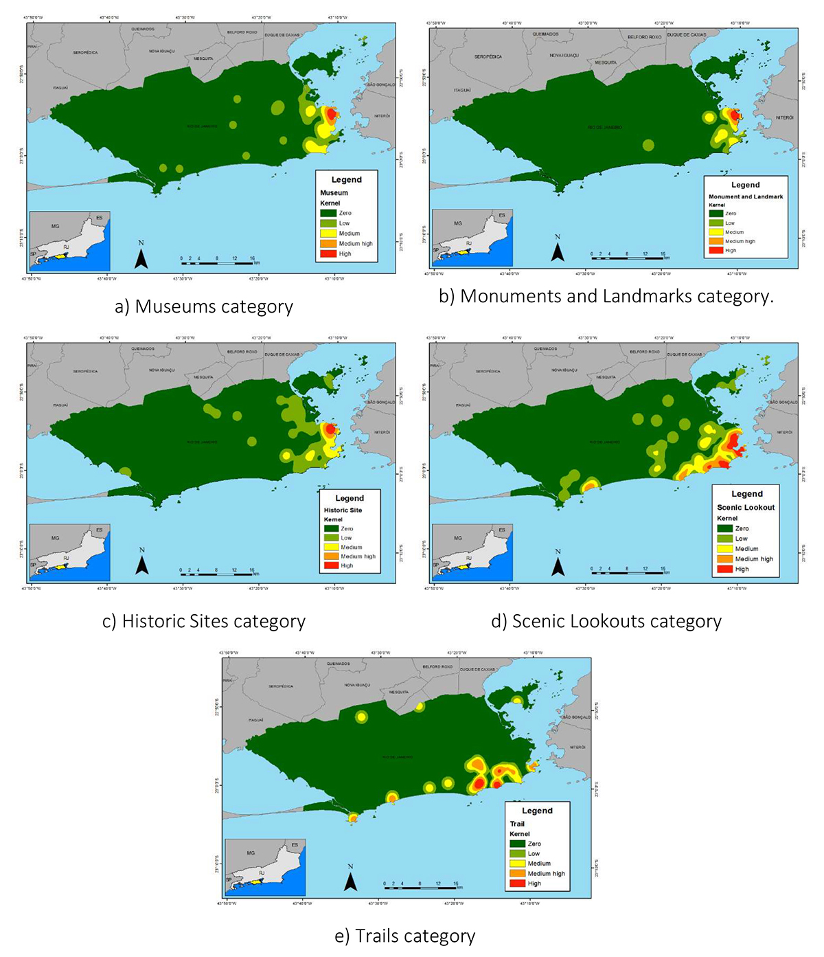 Unlike the categories previously presented (Museums, Monuments and Landmarks, and Historic Sites), the density estimation map for the Scenic Lookouts category (Figure 11d) indicates spots along the seashore and in the hilly areas of the city of Rio de Janeiro, when exiting the concentration of the Centro area of the city shown in the other categories under study. This category has a high concentration of spots in the south zone of Rio de Janeiro, where one can find Morro Pão de Açúcar (Sugarloaf Mountain), Mirante Dona Marta, Pedra do Arpoador, and Mureta da Urca. In this category, the medium-high density areas are located at the beginning of the Barra da Tijuca neighborhood and in Recreio dos Bandeirantes, with some scenic lookouts such as Mirante do Roncador, Mirante do Pontal, and Pedra da Macumba. When analyzing the density map of the Trails category (Figure 11e), high density can be seen in the south zone, particularly near the neighborhoods of: São Conrado, with the Pedra Bonita trail; Vidigal, with the Dois Irmãos; and Alto da Boa Vista, with the highlights being Cachoeira do Chuveiro and Cachoeira dos Primatas. The medium-high density of this category is concentrated in the neighborhoods of: Urca, with the Trilha Morro da Urca trail; Recreio dos Bandeirantes, with Trilha da Prainha and Pedra Pontal; and Grumari, with the Pedra do Telégrafo and Pedra da Tartaruga trails.