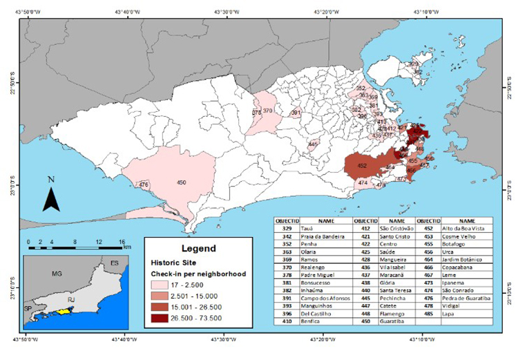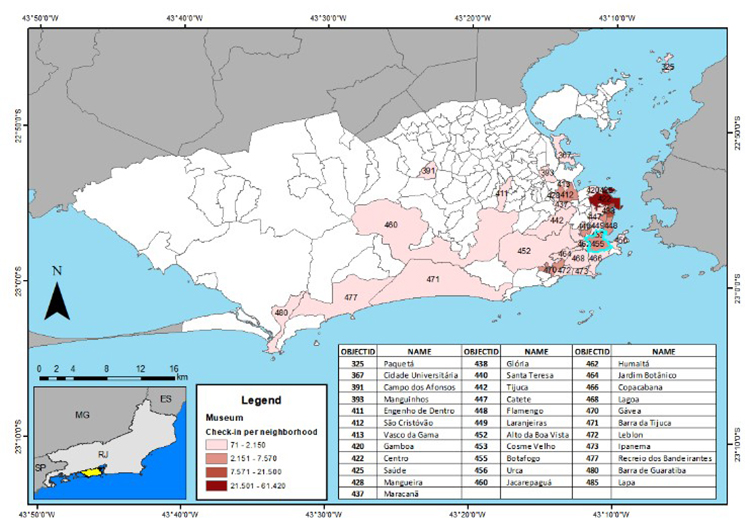Thus, investment in areas that have a desirable flow of tourist visits - those quantitatively indicated as having more than 50 check-ins or that already had an evaluation via the Foursquare application - was considered for the tourism management. In other words, the relevance of the venue given via Foursquare is considered, even if it has not reached the limited visitation mark - stipulated in the filtering - in the application. This kind of analysis is important for mapping priority areas for investment in tourism.