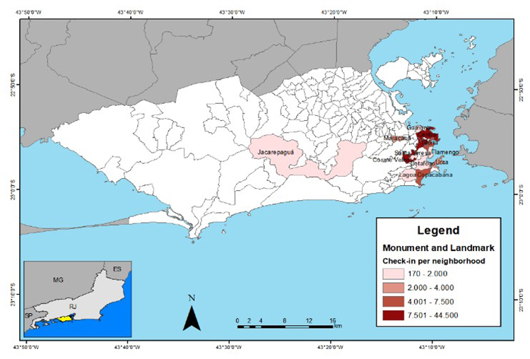 This type of analysis offers a critical view of the municipality's tourism management regarding: the spatial location of these tourism categories, the tourists’ evaluations of the places, and the frequency of the target public. In general, it can be concluded that the data behaved coherently regarding the reality of Rio de Janeiro, thus making Foursquare a highly recommendable application for conducting studies and making decisions for tourism management.