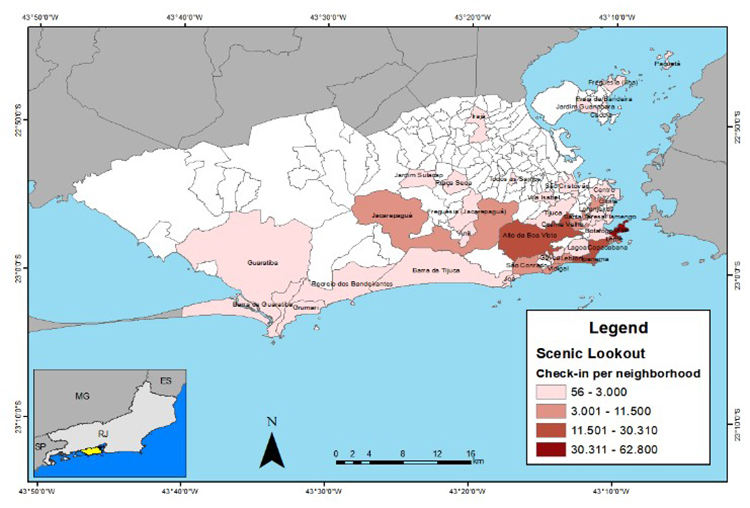 The most visited scenic lookouts (Figure 15) are in the neighborhoods of: Alto da Boa Vista, where the Mesa do Imperador and the Vista Chinesa stand out; Ipanema, with Pedra do Arpoador; Copacabana, with the Copacabana Fort; and Urca, with the highest number of check-ins in Sugarloaf Mountain, Morro da Urca, and Mureta da Urca.
