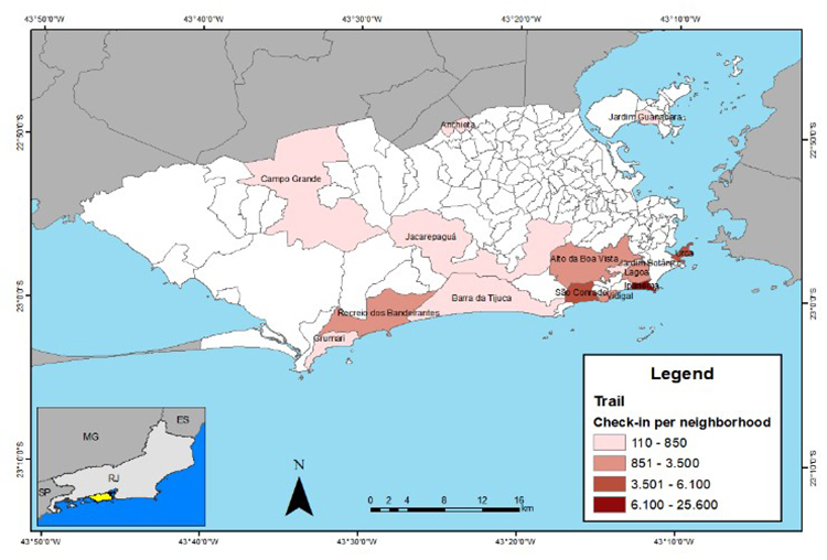 When analyzing the check-in map for the Trails category (Figure 16), the following neighborhoods stood out: Ipanema, with Pedra do Arpoador; Urca, with Sugarloaf Mountain; and São Conrado with Pedra da Gávea and Trilha da Pedra Bonita.