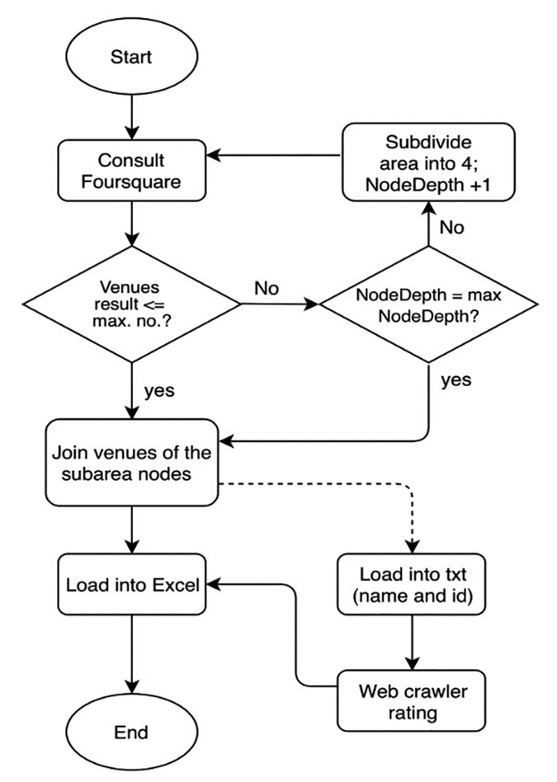 During the code execution process, it could be seen that the API behaves differently (i.e, the total number of venues returned is different) according to the variation in the node established in the code. The variation in the result for the different nodes established was due to the Foursquare API. Due to not having access to the API code, it was not possible to determine the cause of this problem, only to avoid it with the spatial division methods. Therefore, the data mining process used considered the values of 30, 20, 10 and 1 for a maximum number of nodes (NodeDepth) in order to study the most efficient and appropriate method for acquiring all the information of interest. For example, in the case of a node value of 30, the area is subdivided until 30 or fewer venues are returned; whereas, in the case of node value of 1, the area is subdivided until only 1 venue is returned. The node value determines whether or not the search tree will perform a spatial division. Thus, for the Quadtree and K-D Tree algorithms implemented, the tree will continue to perform spatial divisions until the information of the obtained node is equal to or less than the value of the pre-established node.
