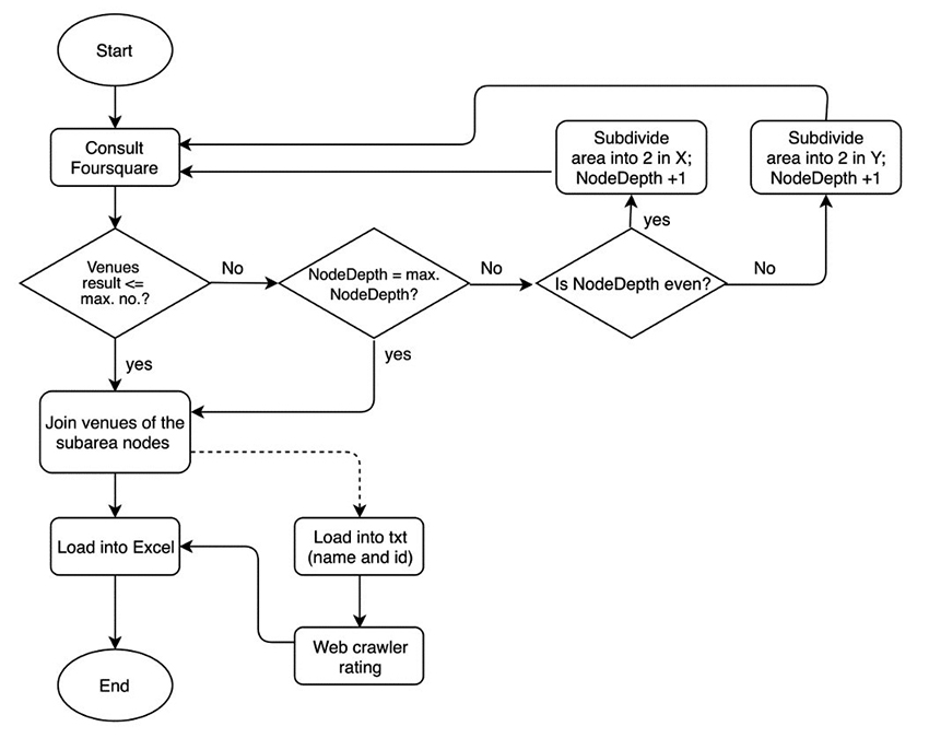 The inefficiency of the data mining done using the grid search structure was evident when considering the high number of venues lost due to the API returning only a maximum of 50 venues. Since the points are not uniformly distributed, the uniform grid will be very small in some areas, where there are no points, or too large, when more than 50 results return. Thus, codes were developed with search based on Quadtree and K-D Tree structures, which enabled subdivision of the area when reaching the 50 venue limit.