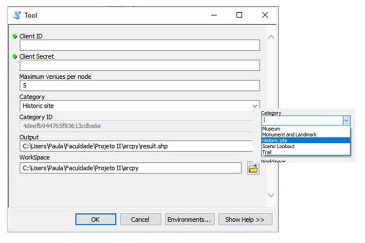 For all three algorithms, the data were exported to an Excel worksheet. However, in order to use them in geoprocessing software, they must first be transformed into points in a coordinate system in shapefile format, through latitude and longitude attributes. In order to automate this process, a tool was implemented for automating the extraction from the Foursquare API, using programming in Python. The script programmed has a Quadtree search algorithm for Foursquare’s API, with input parameters as shown in Figure 5: ClientID and ClientSecret; node value; and a list of categories to be searched in a drop-down list (Museums, Monuments and Landmarks, Historic Sites, Scenic Lookouts, and Trails).
