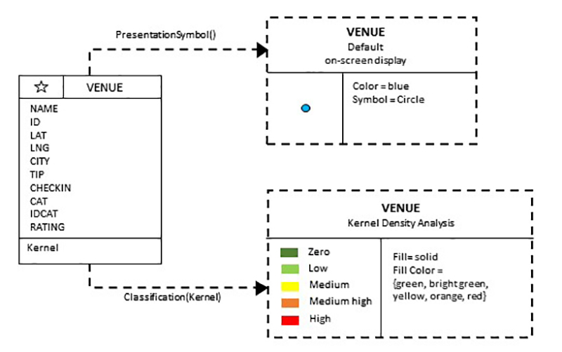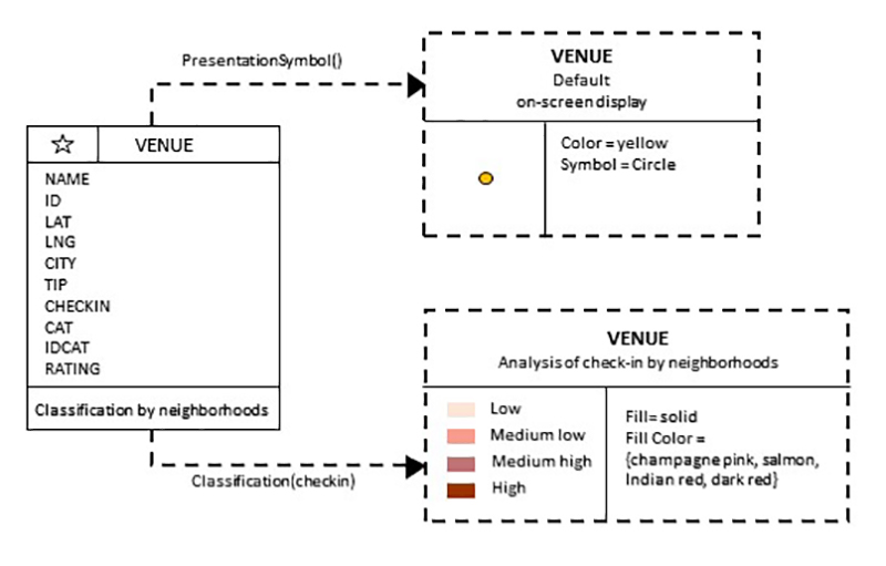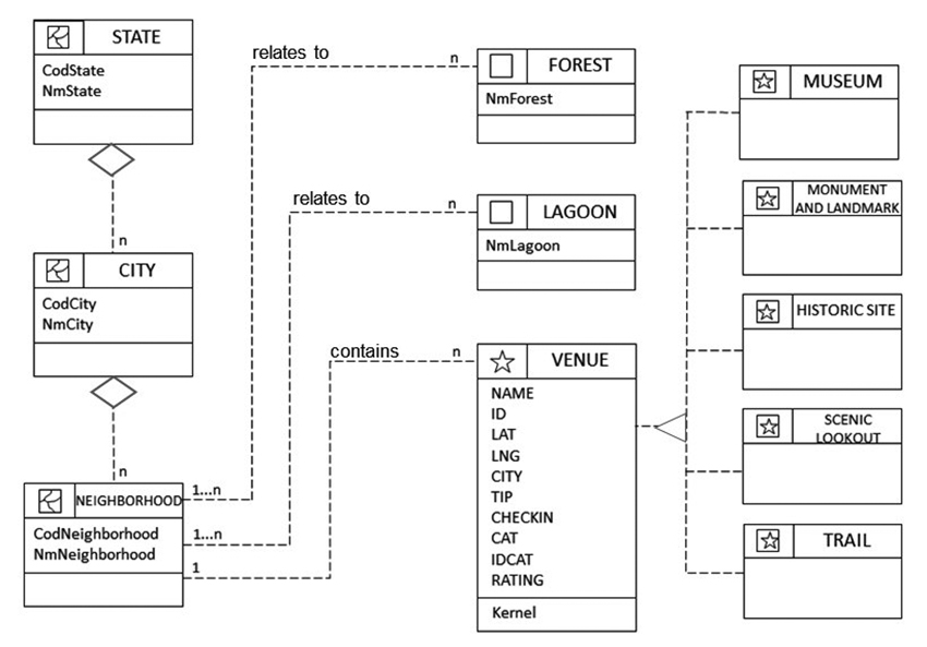 To enable the analysis of the data, a geographic database was created from the model with the classes described using the Object Modeling Technique for Geographic Applications (OMT-G) - see Figure 6. The venue categories used in the search were as follows: Museums, Historic Sites, Monuments and Landmarks, Scenic Lookouts, and Trails. Venues have several attributes that can be accessed in data mining; however, the algorithm constructed for this study was limited to obtaining the location attributes (latitude and longitude), name, venue ID, check-in number, comment number (tip), category name that it belongs to, and category ID.