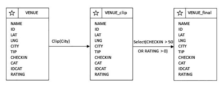 A filtering process was required to perform the analysis of Rio de Janeiro, because much of the information obtained in the categories was not in accordance with the proposal of this work - it could be seen that some venues are in neighboring municipalities and that some places have few check-ins or have no evaluations. Thus, a subset was created to be analyzed via the following criteria (shown in Figure 7): i) venues that are in the city of Rio de Janeiro, and ii) venues that had more than 50 check-ins or a rating higher than zero. For the first criterion, the clip operation was used; while for the second criterion, a selection of attributes was made for venues with more than 50 check-ins or that had a non-zero evaluation.