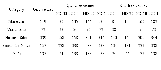 Analyzing the results shown in Table 1, it could be seen that at its initial nodes depth (ND) of 30 and 20, the Grid algorithm had results better than or similar to the Quadtree and K-D tree algorithms. However, as the value of the node depth of the two other algorithms decreases, the inefficiency of the Grid algorithm can be seen for the search of venues in the city. Similarly, when comparing the results obtained by the Quadtree and KD tree algorithms described in Table 1, in their variations for the nodes depth between 30 and 10, it could be seen that the return for the Quadtree algorithm is slightly superior to that of the KD tree algorithm, since it returns more venues. However, for node depth 1, both attained the same number of venues for all the categories. The analysis by category (Figure 10) shows that the largest number of check-ins is in the Historic Sites category, followed by Scenic Lookouts, Museums, Monuments and Landmarks, and Trails.