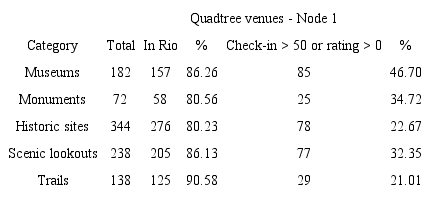 The data returned from the Quadtree algorithm with one node were filtered considering the following criteria: i) the venues within the limits of the Rio de Janeiro city, and ii) those that had more than 50 check-ins or a rating higher than zero. Thus, in the analysis, we considered a subset of the venues found by the Quadtree algorithms for node one, according to the quantitative described in Table 2 for each category. It could be seen that, on average, 85% of the data were in Rio de Janeiro city and that only 31% were considered by the second criterion, and in the filtering, more than 50% of the data acquired for each category were not used in the spatial analysis process, due to being outside the study area and they are not meaningful in this analysis.