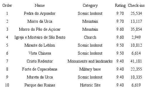 In the ordered list of the tourist places with the highest ratings from visitors, it is interesting to see - in accordance with the tie-breaking criterion of number of check-ins (Table 3) - that among the ten places shown, four are in the Scenic Lookouts category (Pedra do Arpoador, Mirante do Leblon, Vista Chinesa, and Mureta da Urca), and that Morro da Urca and Morro do Pão de Açúcar (Sugarloaf Mountain) also have the subcategory of Scenic Lookout. In other words, six out of the ten highest rated places are in the Scenic Lookouts category, which confirms that the city of Rio de Janeiro has much natural beauty as tourist highlights.