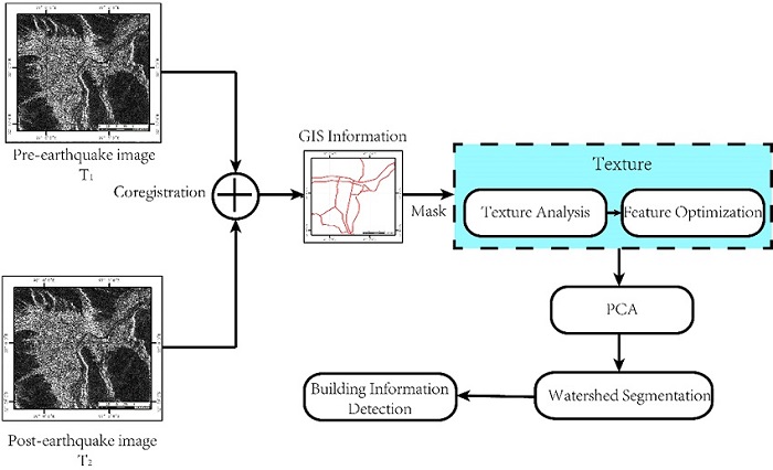 Most existing earthquake damage change detection methods based on SAR images mainly used gray information ( Huang et al. 2010; Gao, Zhang and Wang 2010; Hao, Zhang and Shi 2012; AGHABABAEE, TZENG and AMINI 2012; Hu 2013). Due to the existence of obvious speckle noise in SAR images ( Han, Guo and Wang 2002), detection results usually had high false alarm rates and false negative rates, in which case we can reduce the effects of speckle noise using image processing methods ( Serpico and Moser 2007).With improvements in the resolution of SAR images, texture features were used as the type of image information that can reduce the influence of speckle noise (Wang et al. 2011; Gong et al. 2014). SAR images contain rich texture features, and scholars in China and abroad have used texture for SAR image information extraction ( Liu and Guo 1995; HEROLD, AACK and SOLOMON 2004; WAL, HERMAN and Dool 2005; YAKOUB, LORENZO and FARID 2005; Berberoglu et al. 2007). Wu, Wang and Zhang (2005) fused gray level co-occurrence matrices to calculate texture features of high-resolution SAR images, and then applied an unsupervised classification analysis to extract residences through a statistical analysis of selected suitable feature vectors. Zhao, Qin and Gao (2008) proposed a construction area extraction method based on a gray level co-occurrence texture analysis. This method can extract construction areas effectively and is based on the Bhattacharyya distance and the K-Nearest Neighbor (KNN) classification process. Numerous studies have indicated that gray level information from texture-aided images can improve the accuracy of information extraction from the images ( Xie, Zhang and Xu 2007; Zhang, She and Pan 2008; Zhao, Zhang and Li 2008).