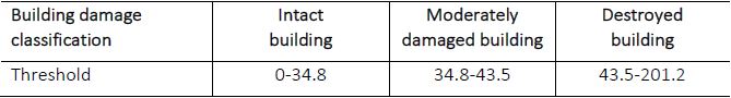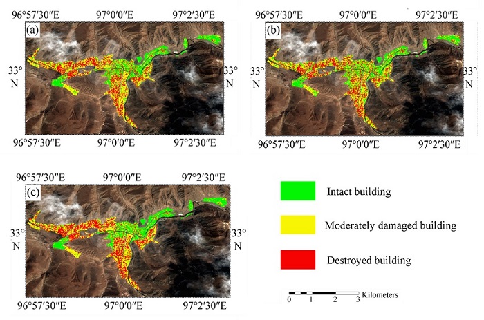 In consideration of SAR images can provide some information about the sides of buildings, because of the influence of the imaging mode and the spatial resolution, SAR images cannot detect details of walls, interiors or foundations of buildings. However, a macro-scale ground investigation can provide a more comprehensive investigation of building structure type, bearing components, cracks, etc. Taking into account the above considerations, remote sensing seismic damage investigation is usually divided into 3 categories, (1) intact building, (2) moderately damaged building (containing the second and third category in ground investigation) , and (3) destroyed building (containing the fourth and fifth category in ground investigation) , through the combination with ground investigation results.