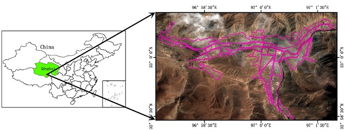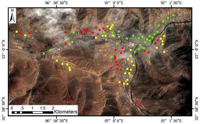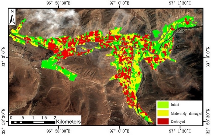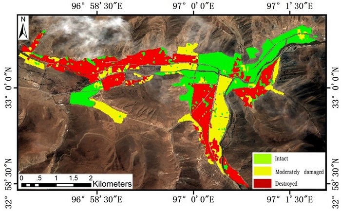 The investigated case study is the Yushu earthquake on April 14, 2010 (Mw 7.1).The earthquake devastated a huge area in Qinghai province, killing and injuring a large number of people and causing major damage to buildings and other infrastructures ( Yu 2010; Li et al. 2013). The earthquake epicenter was located near the town of Jiegu, Yushu County. Jiegu (centered at approximately 33.003°N and 97.006°E) was one of the most affected areas.