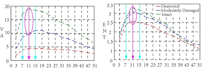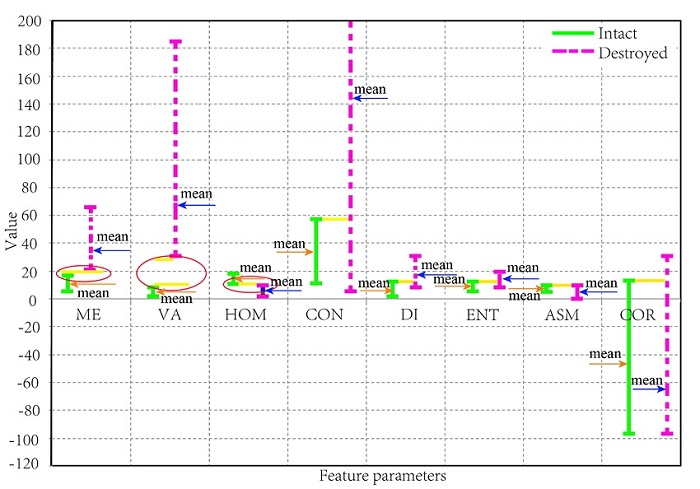 To illustrate the dissimilarity between the different features, the actual feature parameters are enlarged 10 times. Figure 3 shows the statistical analysis of the range of the characteristic values. As shown in the figure, there are differences in the ability to distinguish different grade of earthquake damaged buildings. The parameter value of the ME, VA and HOM are smaller in the overlap distribution between the intact building and the damaged building. The results indicate that the three features can be used to distinguish buildings with different grades. Consequently, ME, VA and HOM are chosen to detect the information in this experiment.