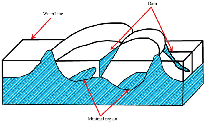 Object construction refers to segmenting an image into several mutually disjoint segments whose internal features are relatively homogeneous and differ from each other. The spatial distribution of the buildings after earthquake is diverse and the structure is complex. To keep the consistency of segments and avoid the effects of PCs of multi texture features obtained by statistical methods, multi-data segmentation strategy is adopted in this study. The gradient images of Pcs of texture features in the multi-temporal data set are segmented using the same segmentation method. The segmentation is carried out using the watershed segmentation algorithm. This algorithm based on mathematical morphology belongs to the class of region growing segmentation methods, which is an iterative process. The algorithm is mainly divided into two steps. The first step is a sorting process, and the second step is the submergence process. In the algorithm, the feature level of each pixel is sorted from low to high, and then, each local minimum is judged and labeled by the first in first out (FIFO) structure within the threshold influence domain. Vincent and Soille (1991) were the first to apply this method to image segmentation. Watershed segmentation is a highly regarded and widely used segmentation technology ( Gonzalez and Woods 2005). Watershed segmentation algorithm regards the image as a "topographic map", where the pixels with greater brightness values are larger, while the pixels in the darker areas are smaller. The image is segmented by seeking the "basin" and "watershed boundaries". In SAR images, intact buildings are expressed as a regular brightness area, while seismically damaged buildings appear as broken spots. These spots are favorable to the formation of catchment basins, which form in the surrounding watershed, and the formation of bright regional images, namely, image objects. Image segmentation is realized by marking different regions as injection points. In this experiment, three kinds of markers, such as intact buildings, moderately damaged buildings and destroyed buildings are marked. To eliminate the over segmentation caused by the small change of features in the image, we need to set the minimum suppression threshold to limit the gradient image, which is the most important setting parameter in the watershed segmentation algorithm. A schematic diagram showing watersheds and water basins is shown in Figure 4. More details about the segmentation algorithm can be found in Vincent and Soille (1991).