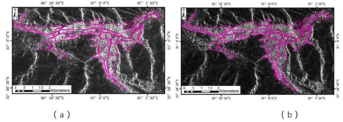 Two ALOS-1 PALSAR intensity images on 2010.01.15 and 2010.04.17 with the direction of ascending were used for analysis and experimentation. The detailed parameter information of the dataset is shown in Table 2. An optical multispectral image covering the study area was used as reference data. On April 15, QuickBird satellite obtained a number of images of the areas including the town of Jiegu. After data fusion processing, the image is composed of 4 bands and the resolution is 0.6m. Based on the post-earthquake optical image, a reference map of the different grade damage buildings can be generated by careful interpretation. The reference map can be regarded as the ground truth for analysis and validation. Figure 6 illustrates the research area, the optical image and building distribution map. Figure 7 presents the experimental data, Figure 7(a) and Figure 7(b) illustrate ascending SAR images superimposed by the building distribution. The building distribution were generated by visual interpretation from optical image.